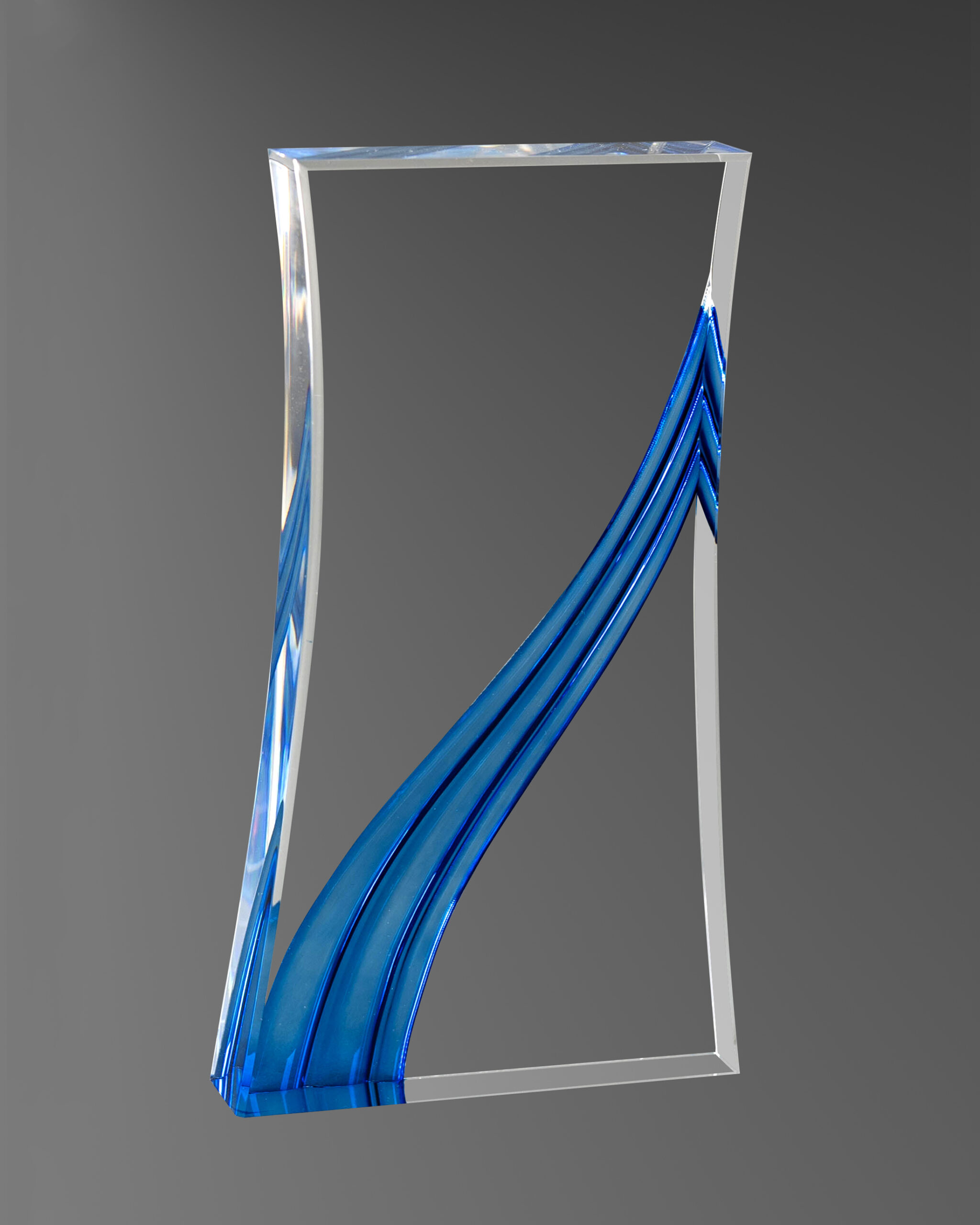 New for 2025! Freestanding clear acrylic trophy with semi-translucent colored scalloping. A dazzling display of color and light, sure to impress.