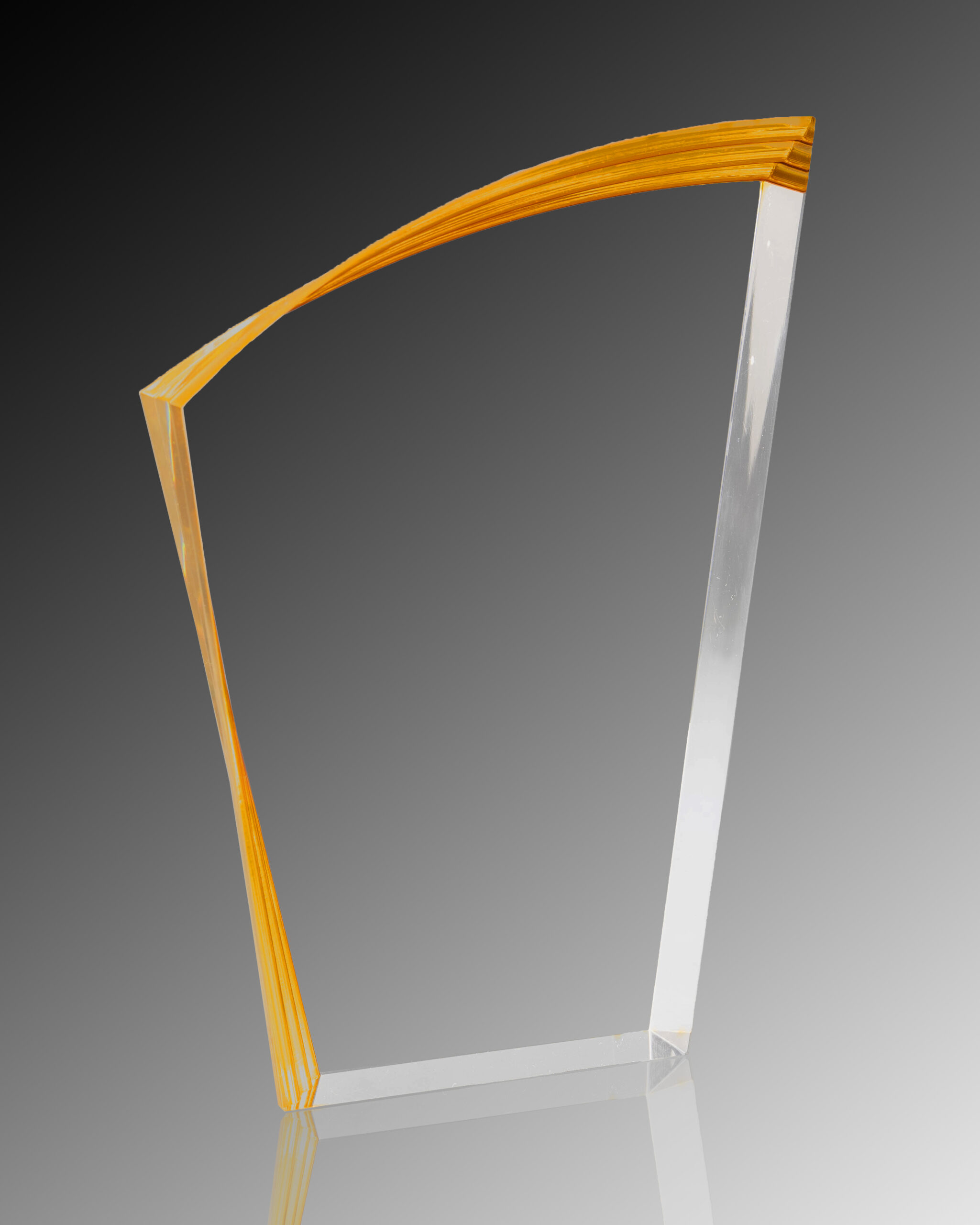 New for 2025! Freestanding clear acrylic trophy with semi-translucent colored scalloping. A dazzling display of color and light, sure to impress.